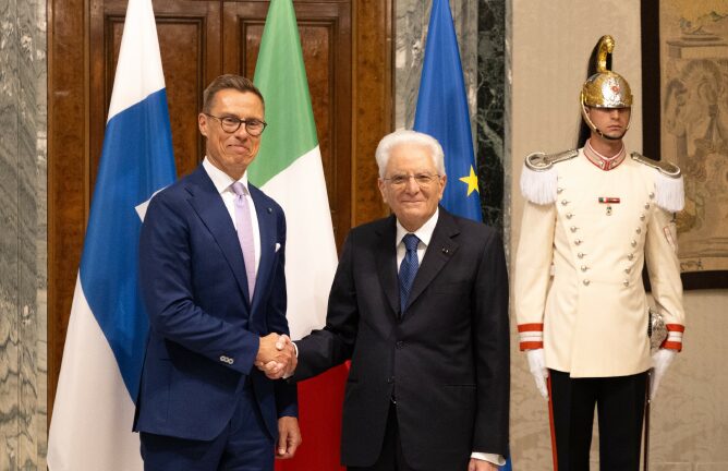 President of the Republic of Finland Alexander Stubb and his spouse Suzanne Innes-Stubb received May Day greetings in the courtyard of the Presidential Palace on 1 May 2024. Photo: Roni Rekomaa/Office of the President of the Republic of Finland