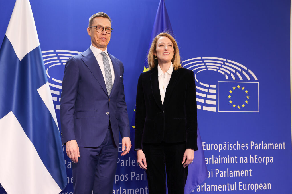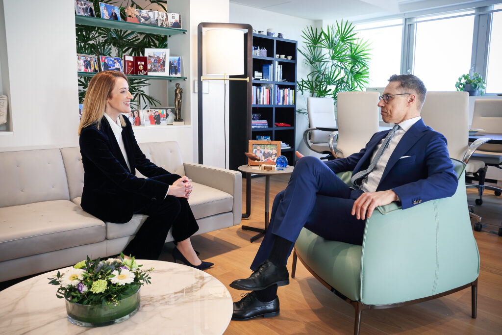 President Alexander Stubb began the second day of his visit to Brussels with a meeting with President of the European Parliament Roberta Metsola on 10 April 2024. Photo: Juhani Kandell/Office of the President of the Republic of Finland