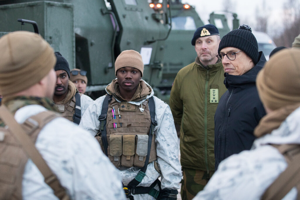 The visit ended at the Sennalandet Fell Plateau, where President Stubb and Prime Minister Gahr Støre had the opportunity to follow the exercises of the 10th Marine Regiment of the US Marine Corps. President Stubb was also introduced to armoured all-terrain vehicles and the HIMARS (High Mobility Artillery Rocket System), and finally discussed with soldiers taking part in the exercise.