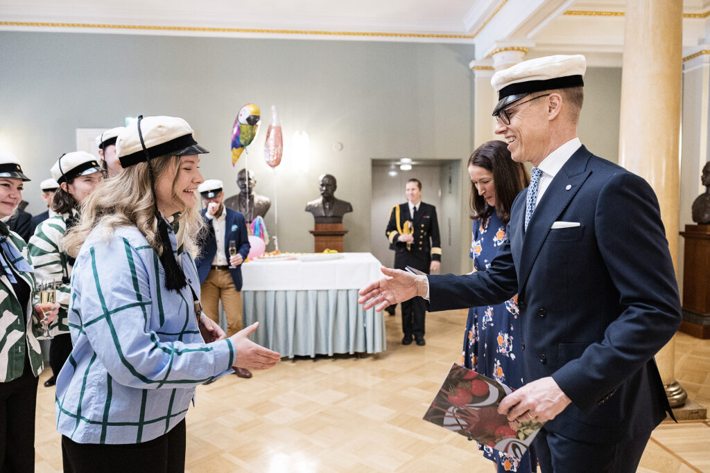 Led by Pasi Hyökki, the YL Male Voice Choir with 40 singers performed the songs Ylioppilaslaulu and Elli Dunbar. Risto Karinkanta, chair of the Student Union of the University of Helsinki, presented the student union’s greetings. University students have been bringing their May Day greetings to the President of the Republic of Finland since the 1950s.