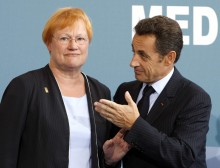 Ranskan presidentti Nicolas Sarkozy toivotti presidentti Tarja Halosen tervetulleeksi EU:n ja Välimeren maiden huippukokoukseen Pariisiin. Kuva: Lehtikuva / Reuters/Charles Platiau