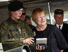 President Halonen bekantar sig med kustförbandens materiel i Pansio. Undersergeant Kristoffer Hykkyrä och kommendören för marinen viceamiral Hans Holmström (till höger) förevisar en kustrobot för presidenten. Foto: Lehtikuva