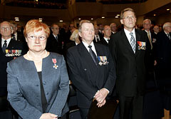 Presidentti Tarja Halonen, Sotainvalidien Veljesliiton puheenjohtaja Veli Matti Huittinen ja pääministeri Matti Vanhanen Sotainvalidien Veljesliiton 65-vuotisjuhlassa. Kuva: Lehtikuva