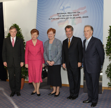 The presidents of five EU countries met in Helsinki on 22-23 April 2005. President of the Republic Tarja Halonen had invited for an informal meeting President Horst Köhler of Germany, President Heinz Fischer of Austria, President Jorge Sampaio of Portugal and President Vaira Vike-Freiberga of Latvia.
