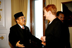 President of the Republic Tarja Halonen met Vice President Jusuf Kalla of Indonesia at the Presidential Palace on Friday, 20 January 2006. Among other things they discussed the Aceh peace process and post-tsunami reconstruction as well as Finland's coming EU Presidency and the Asia Europe Meeting that will take place during it.