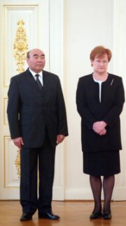 President Askar Akajev of the Kyrgyz Republic made a working visit to Finland on 2-4 April 2003 at the invitation of President of the Republic Tarja Halonen. The reception ceremonies and official discussions between the presidents took place at the Presidential Palace on Thursday 3 April, in addition to which President Akajev met President Martti Ahtisaari and the Vice Speaker of the Parliament Liisa Jaakonsaari and gave a lecture at the Paasikivi Society. His programme also included visits to Finnish companies and the Mannerheim Museum.
