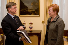 Puheenjohtaja Nurminen lahjoitti tapaamisen yhteydessä presidentti Haloselle erikoispainoksen kirjasta Navigoinnin historia.