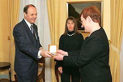 Paasikivi-seuran edustajat luovuttivat tasavallan presidentti Tarja Haloselle mitalin Presidentinlinnassa 20.1.2005.