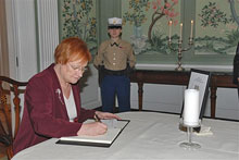 Tasavallan presidentti Tarja Halonen ja tohtori Pentti Arajärvi allekirjoittivat Yhdysvaltojen entisen presidentin Gerald R. Fordin surunvalittelukirjan Yhdysvaltojen suurlähetystössä Helsingissä 4. tammikuuta 2007.
