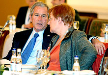 Presidentti Halonen ja Yhdysvaltain presidentti George Bush työlounaalla Bukarestin huippukokouksessa. Kuva: Lehtikuva