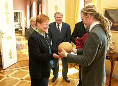Loimaan ammatti-instituutin oppilas, Tuomas Venäläinen, luovuttamassa tekemäänsä astiastoa presidentti Haloselle.
