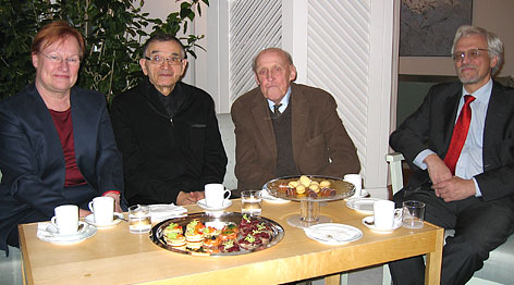 Presidentti Halonen, taidemaalari Rafael Wardi, kirjailija Bo Carpelan ja tohtori Pentti Arajärvi Mäntyniemessä. Copyright © Tasavallan presidentin kanslia