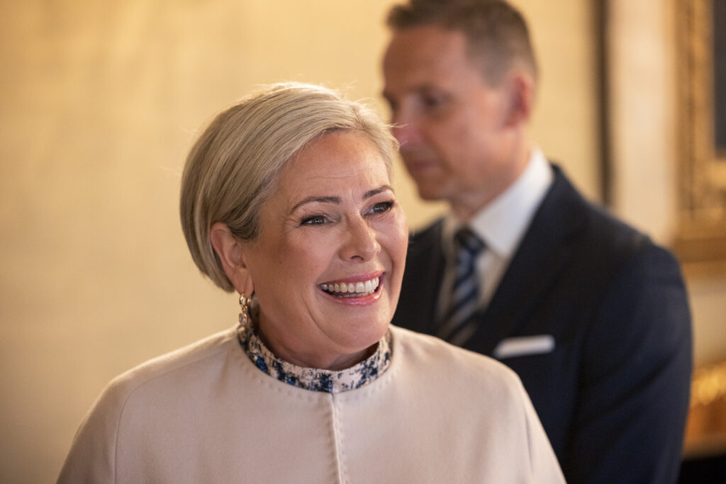 Islannin presidentti Halla Tómasdóttir aloitti yhdessä puolisonsa Björn Skúlasonin kanssa valtiovierailun Suomeen 7. lokakuuta 2025. Vierailua isännöivät tasavallan presidentti Alexander Stubb ja rouva Suzanne Innes-Stubb. Kuva: Matti Porre/Tasavallan presidentin kanslia