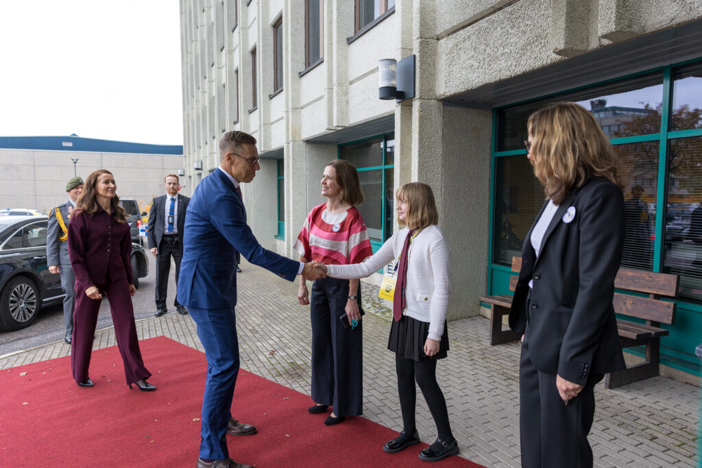 NYT Yrityskylässä Espoossa presidenttiparit pääsivät tutustumaan oppimiskokonaisuuteen, joka tarjoaa työelämä-, yrittäjyys- ja taloustaitoja kuudes- ja yhdeksäsluokkalaisille Kuva: Emmi Syrjäniemi / Tasavallan presidentin kanslia