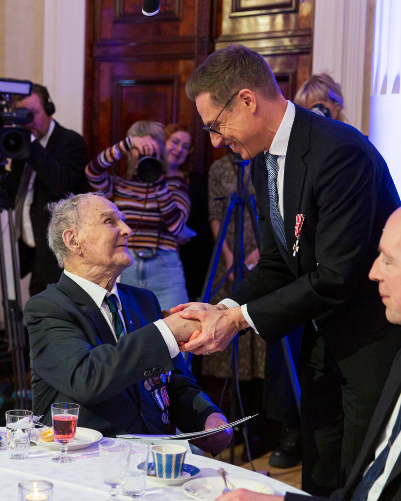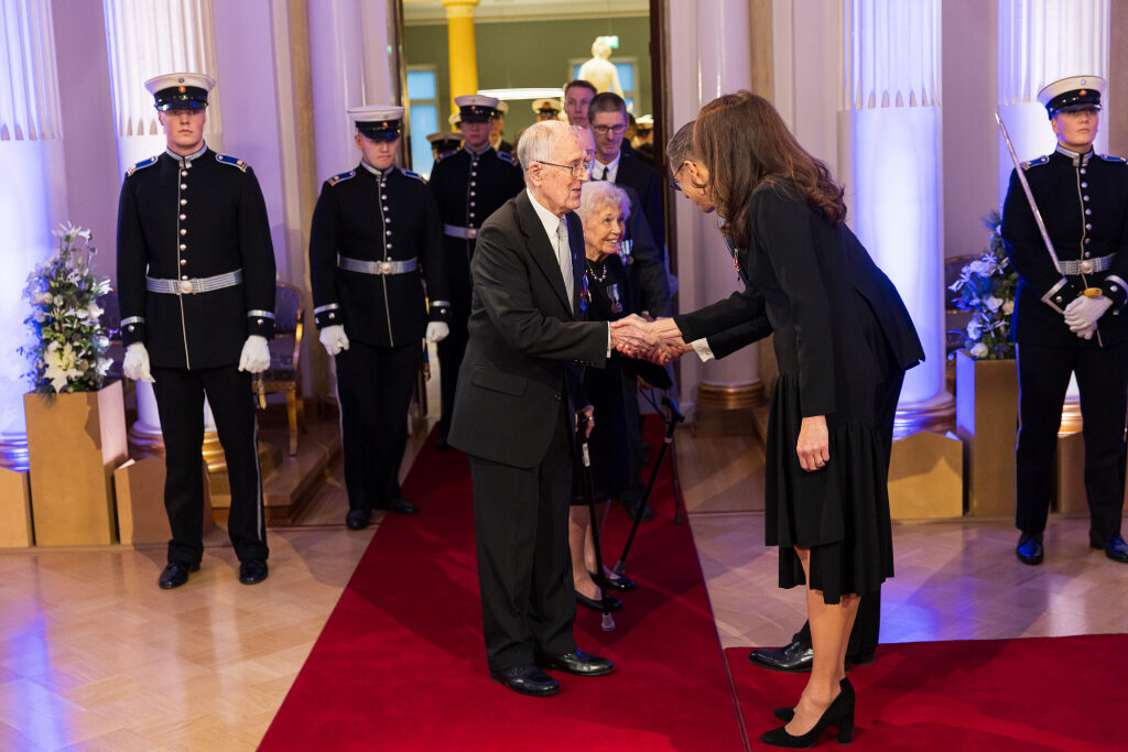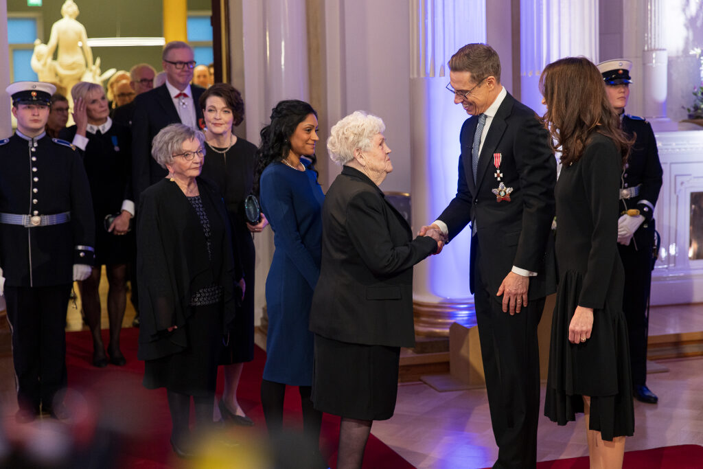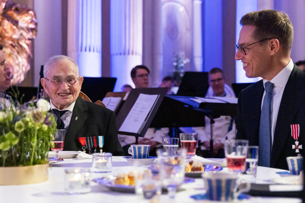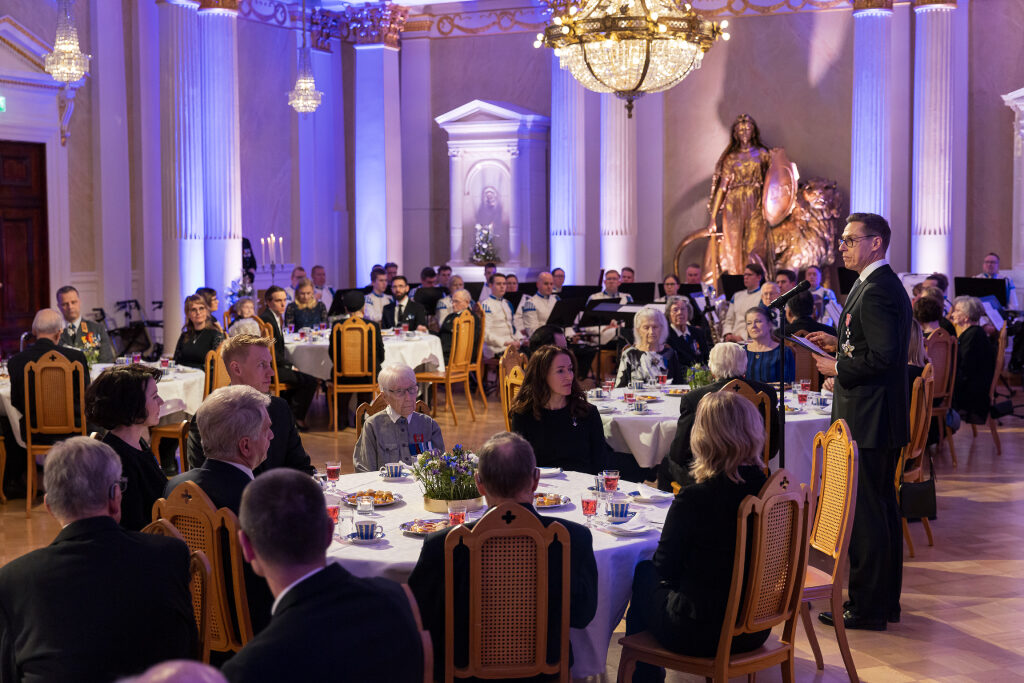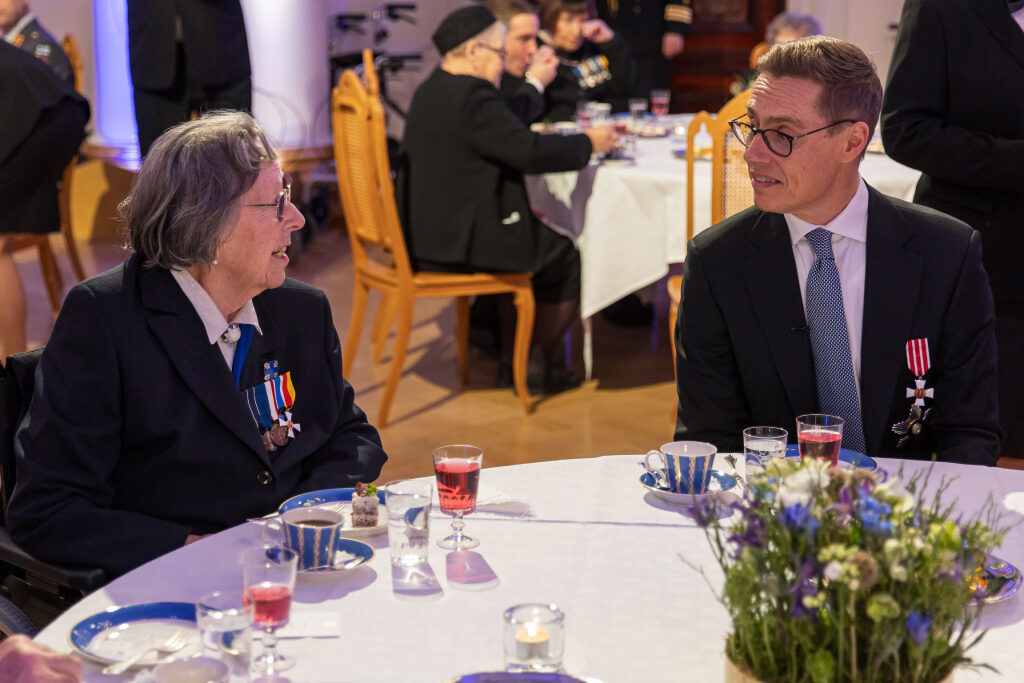 Tasavallan presidentti Alexander Stubb kutsui puolisonsa Suzanne Innes-Stubbin kanssa Sotiemme veteraaneja ja lottia juhlatilaisuuteen Presidentinlinnaan alkuviikosta maanantaina 2. joulukuuta.
