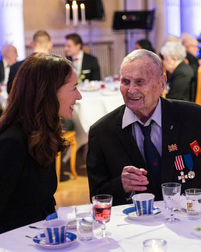 Presidenttipari kiersi veteraanien ja lottien pöydissä keskustelemassa kunniavieraiden kanssa. Valtiosalissa pidettyyn juhlaan osallistui noin 20 sotiemme veteraania ja lottaa.