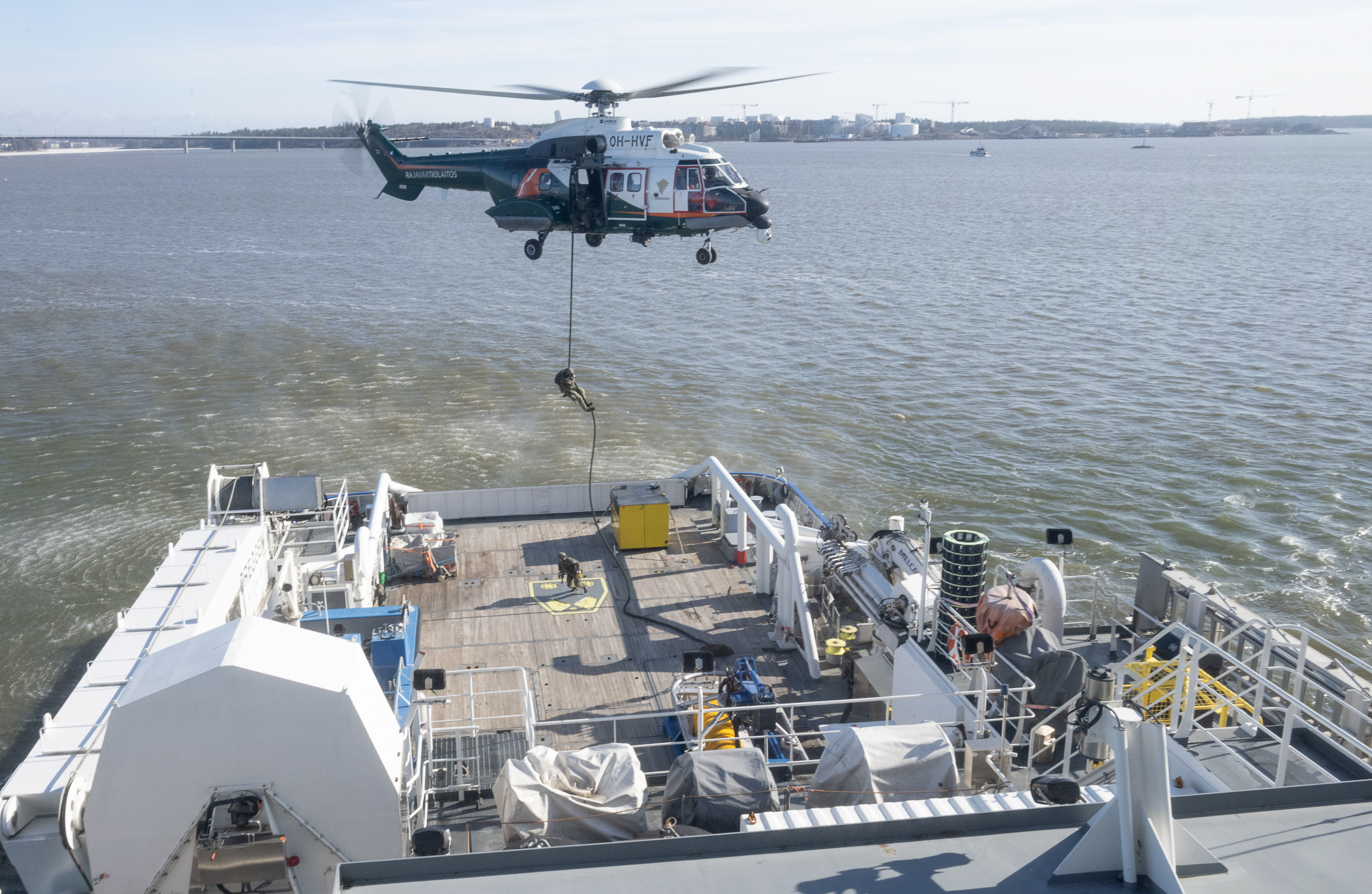 JEF country leaders visited vessel Turva of The Finnish Coastguard in Helsinki harbour. Prime ministers and Finlands President Alexander Stubb followed a demonstrated action of a helicopter occupying a hostile vessel. Photo Jussi Nukari/Office of the President of the Republic of Finland