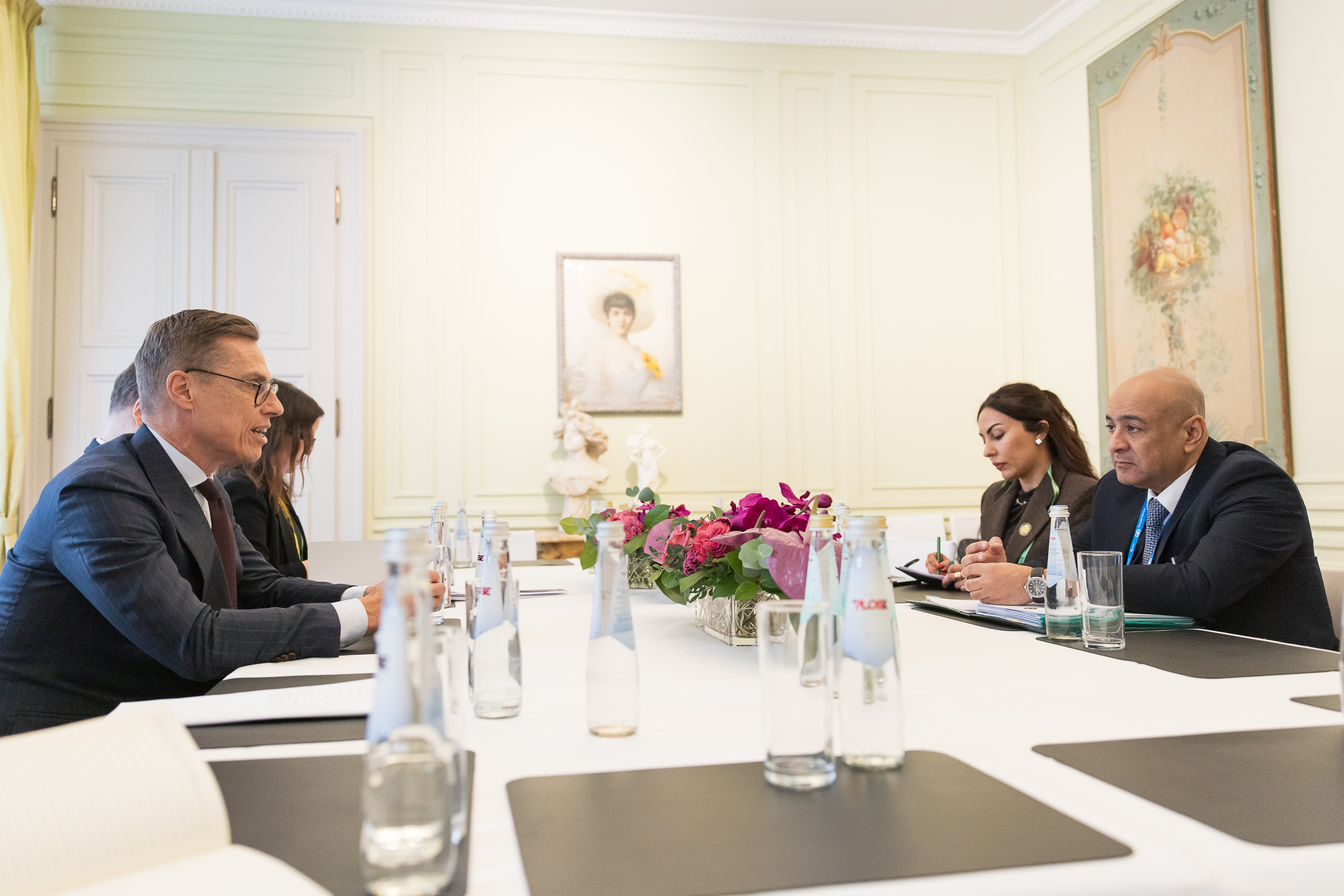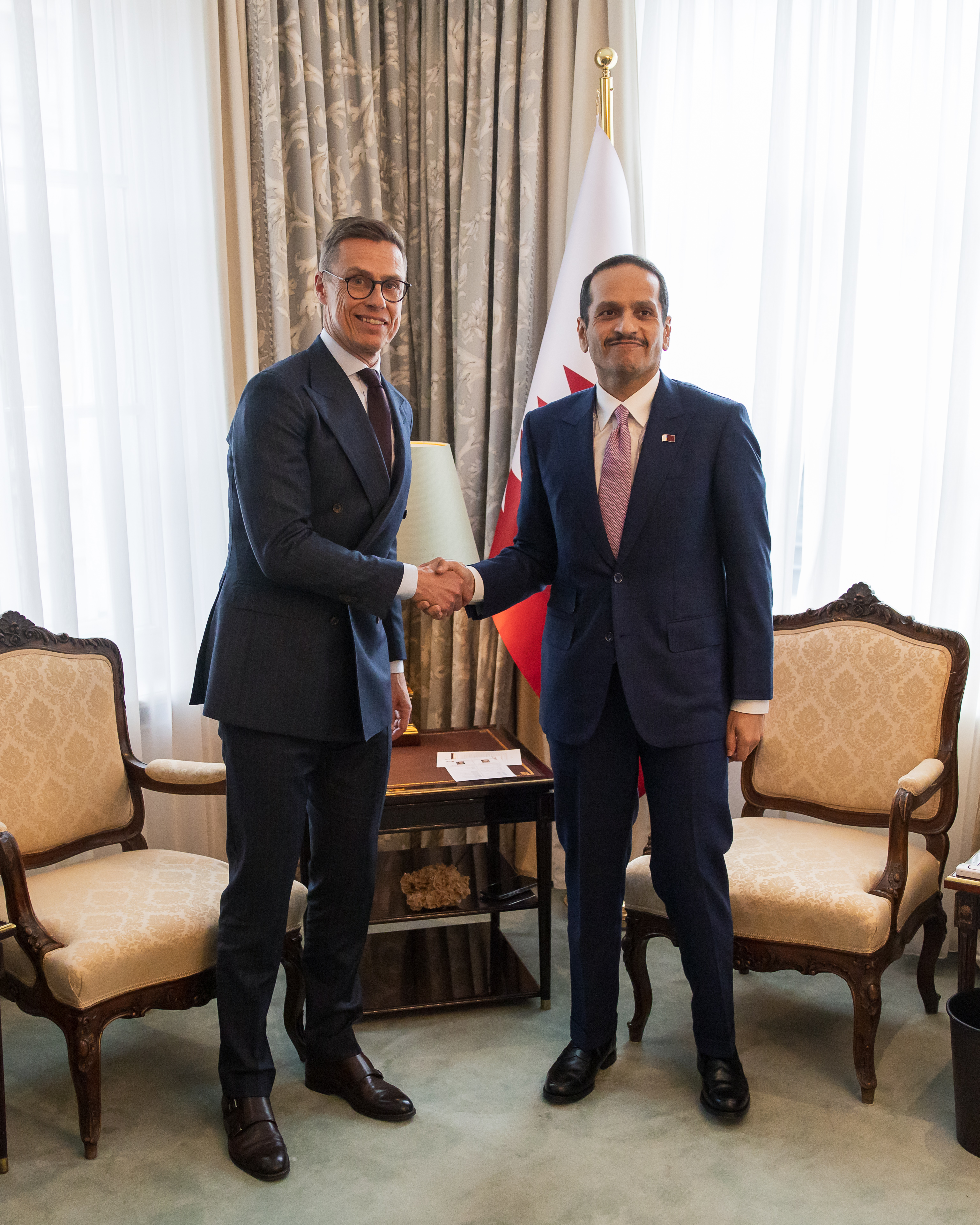 Presidentti Stubb tapasi Qatarin pää- ja ulkoministerin Mohammed bin Abdulrahman bin Jassim Al Thanin. Tapaamisessa oli mukana ulkoministeri Elina Valtonen. Kuva: Matti Porre/Tasavallan presidentin kanslia