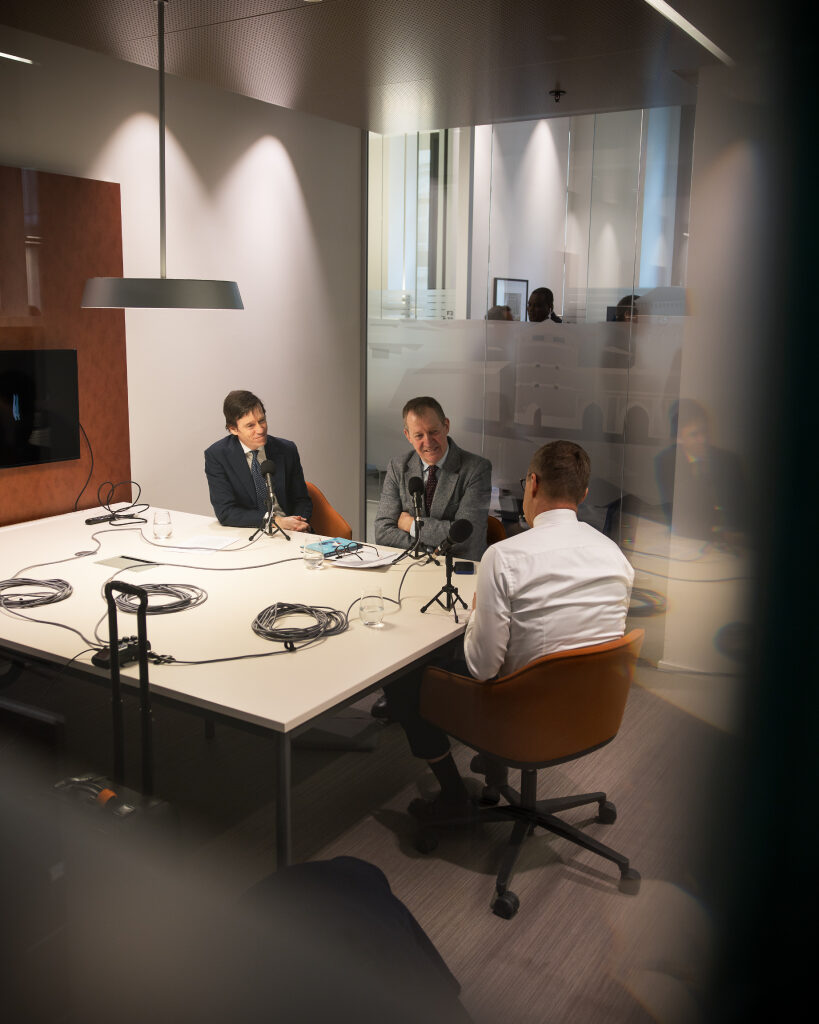 Brittiläisen The Rest is Politics -podcastin juontajat Rory Stewart and Alastair Campbell haastattelivat presidentti Stubbia. Kuva: Matti Porre/Tasavallan presidentin kanslia