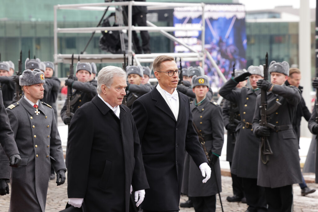 Tasavallan presidentti Sauli Niinistö ja tuleva presidentti Alexander Stubb lähtevät Presidentinlinnasta kohti eduskuntataloa. Kuva: Roni Rekomaa/Tasavallan presidentin kanslia