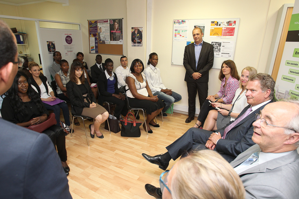 On Wednesday morning, President Niinistö visited the Mission Locale for Paris, a support and advice centre for 16-25 year-olds who have left school. There, young people receive personal advice on issues such as job applications and choice of educational establishment, as well as accommodation and other practical issues. The President conversed with youngsters on their views of the future and was briefed on France’s employment measures and the apprenticeship training contract, among other issues.