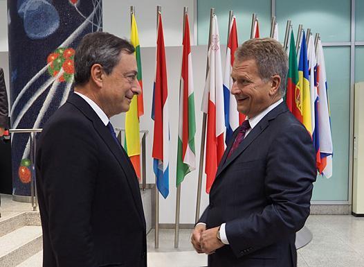 President of the Republic, Sauli Niinistö met Mario Draghi, President of the European Central Bank in Frankfurt on Monday, 6 October. The topics discussed included the economic situation in Europe and the broader outlook for the world economy. After the private talks, discussions continued with ECB Executive Board members.
