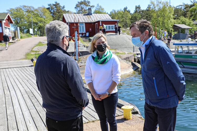At Örö, President Niinistö met Erika Strandberg, Municipal Manager of the Municipality of Kimitoön, and Daniel Wilson, Chair of the Municipal Council. Photo: Jouni Mölsä/Office of the President of the Republic