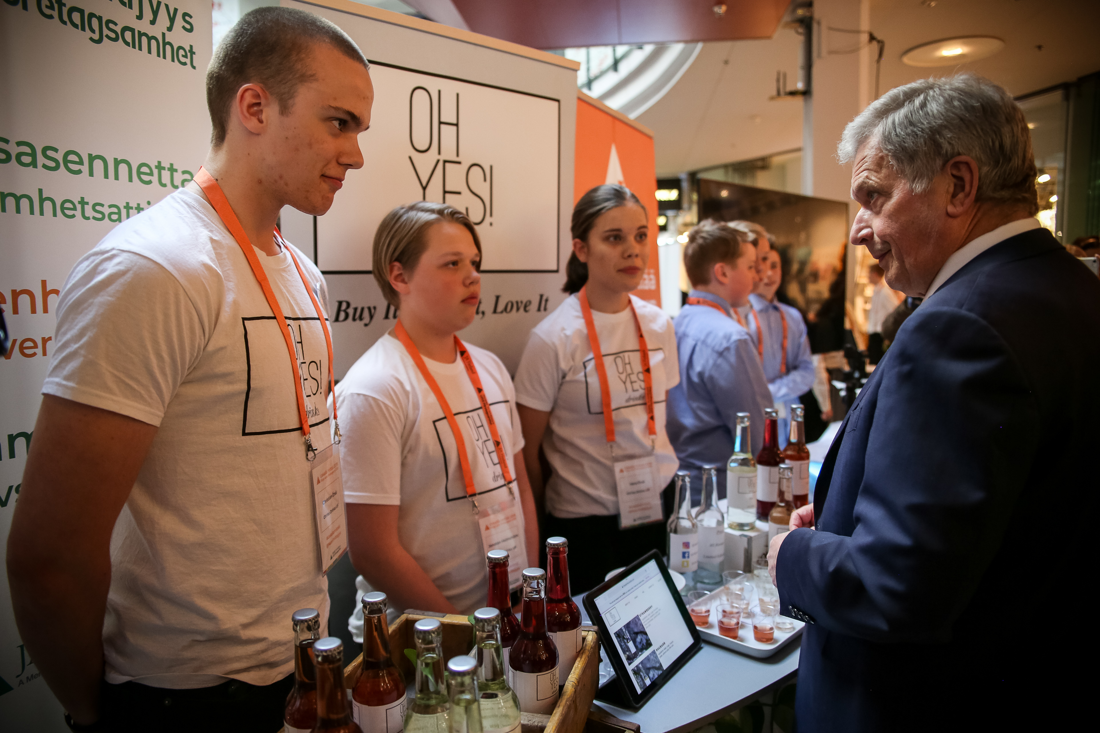 Presidentti Niinistö tutustui nuorten yrittäjyyskilpailun loppukilpailussa oleviin yrityksiin. Finaalissa on mukana 79 yritystä ja 230 nuorta, jotka ovat pyörittäneet omia NY-yrityksiään lukuvuoden ajan osana opintojaan.