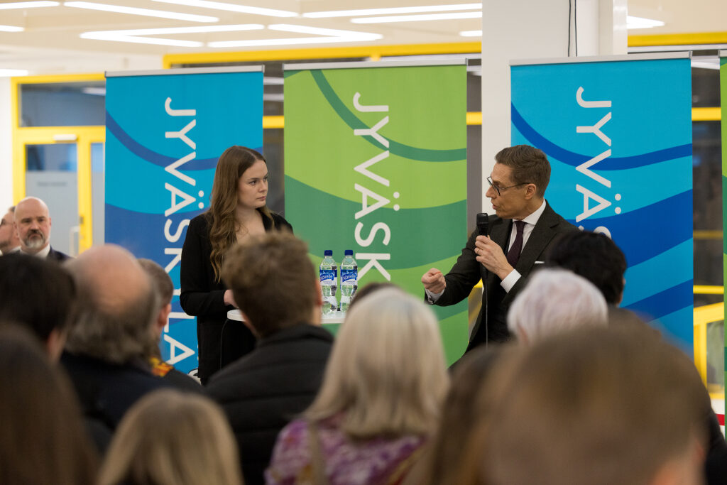 Vierailullaan presidentti Stubb piti ensimmäisen osan alkavaa Martti J. Kari -muistoluentosarjaa Jyväskylän yliopistossa. Puheessaan presidentti muisteli sotilastiedustelun asiantuntijana toiminutta Martti J. Karia ja tämän kanssa käymiään keskusteluja lämmöllä. Luennon teemana oli ”Maailmanpolitiikka murroksessa: Moninapainen epäjärjestys vai monenkeskinen järjestys”.