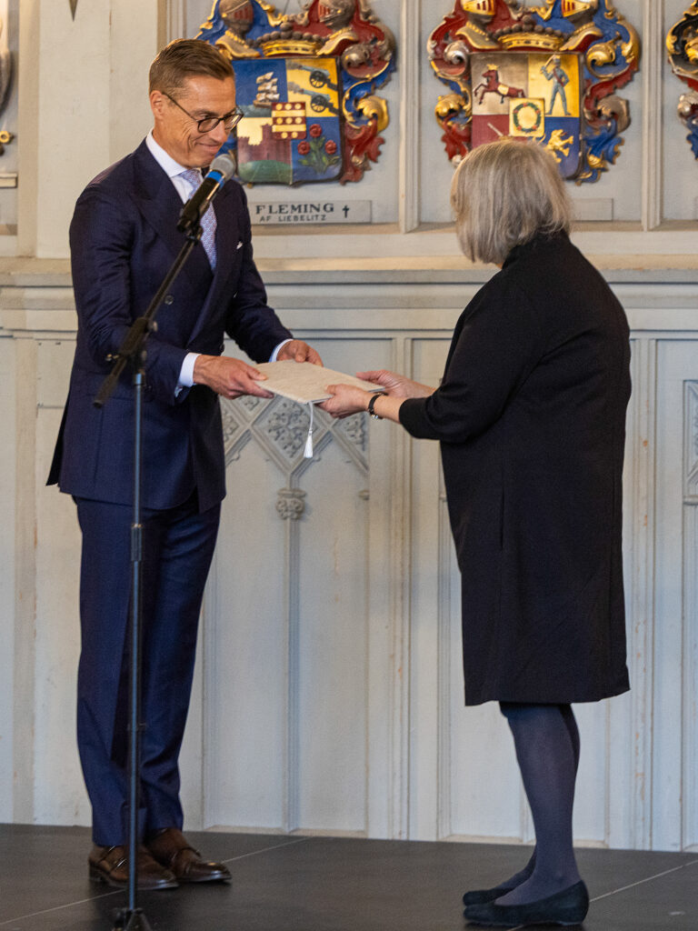 Tasavallan presidentti Alexander Stubb luovutti taiteen akateemikon arvonimen arkkitehti Mona Schalinille perjantaina 24. lokakuuta 2025 Ritarihuoneella.