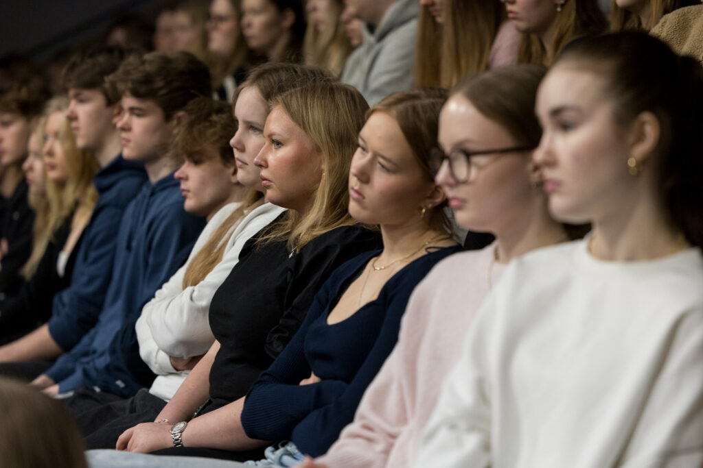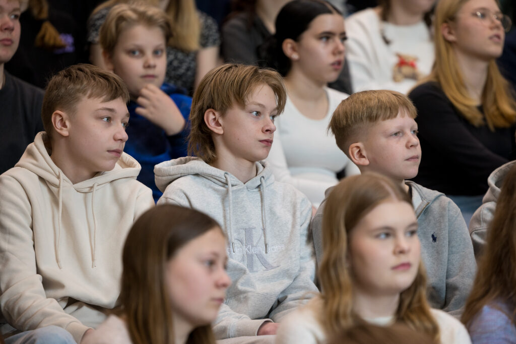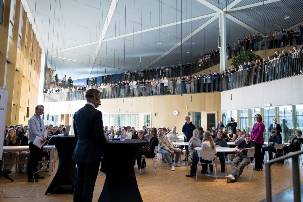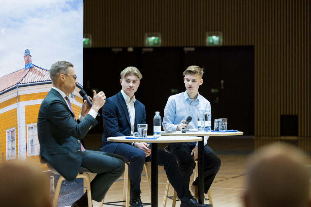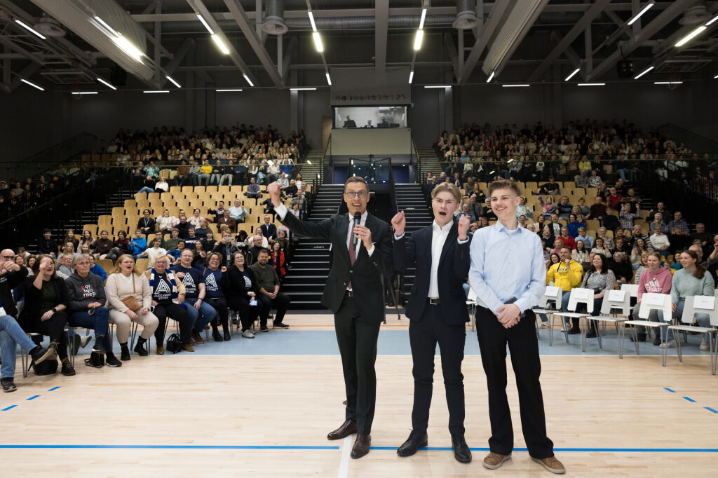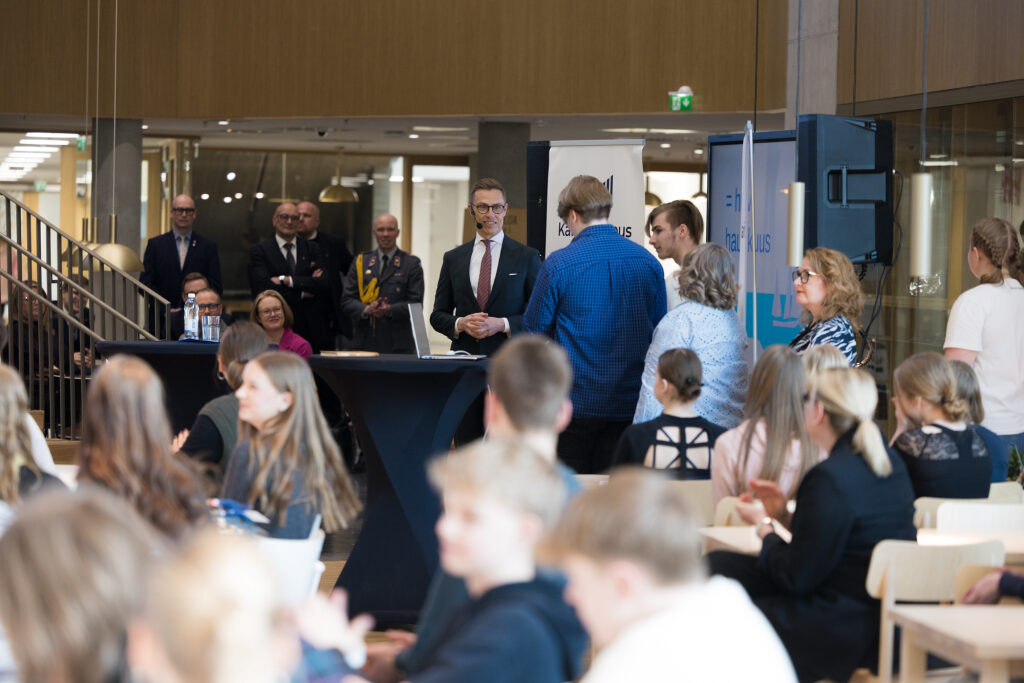 Vierailu jatkui Karin kampuksella, jossa presidentti tapasi Hj. Nortamon peruskoulun yläkoulun oppilaita sekä myöhemmin satakuntalaisia yleisötilaisuudessa.
