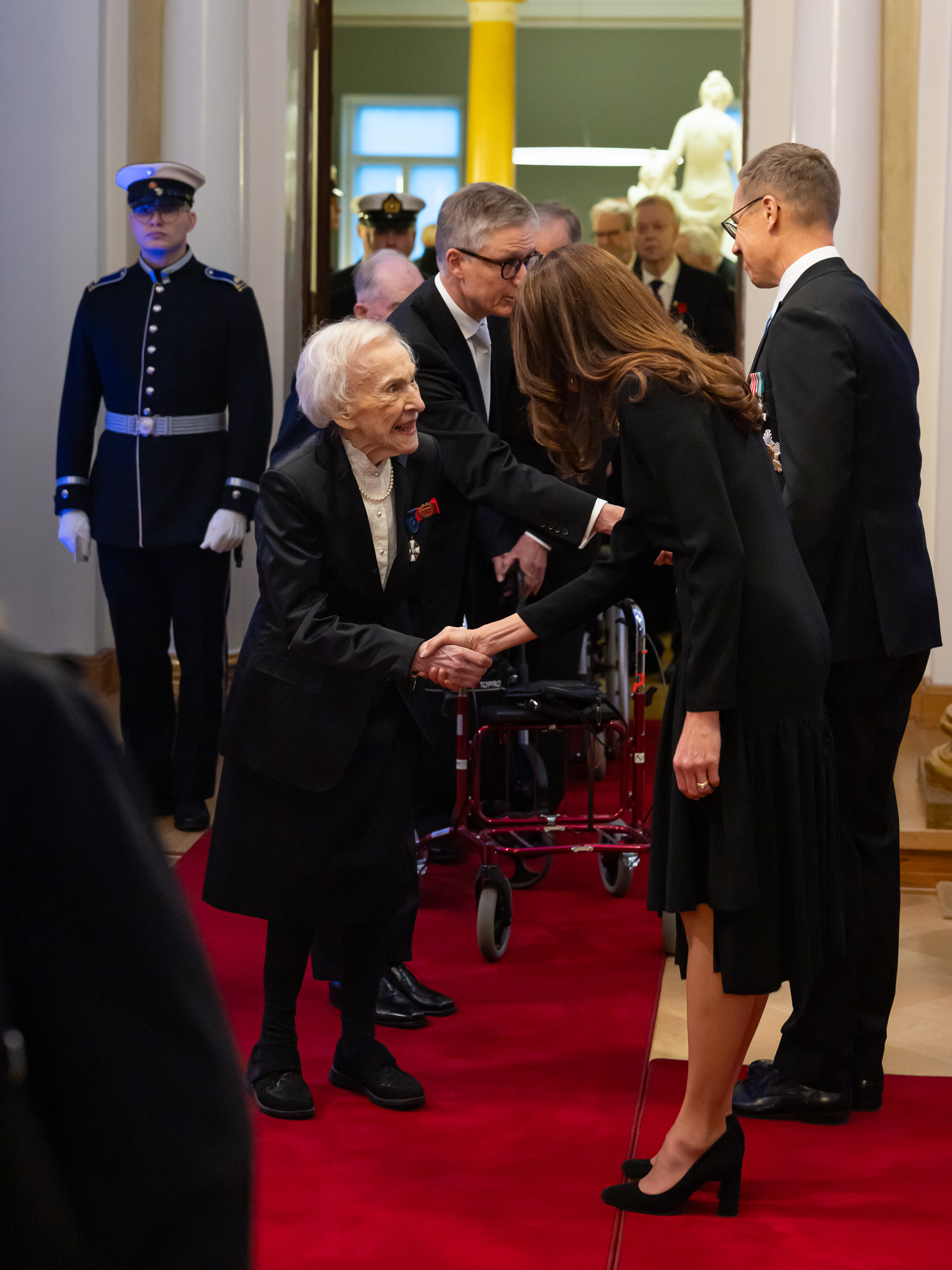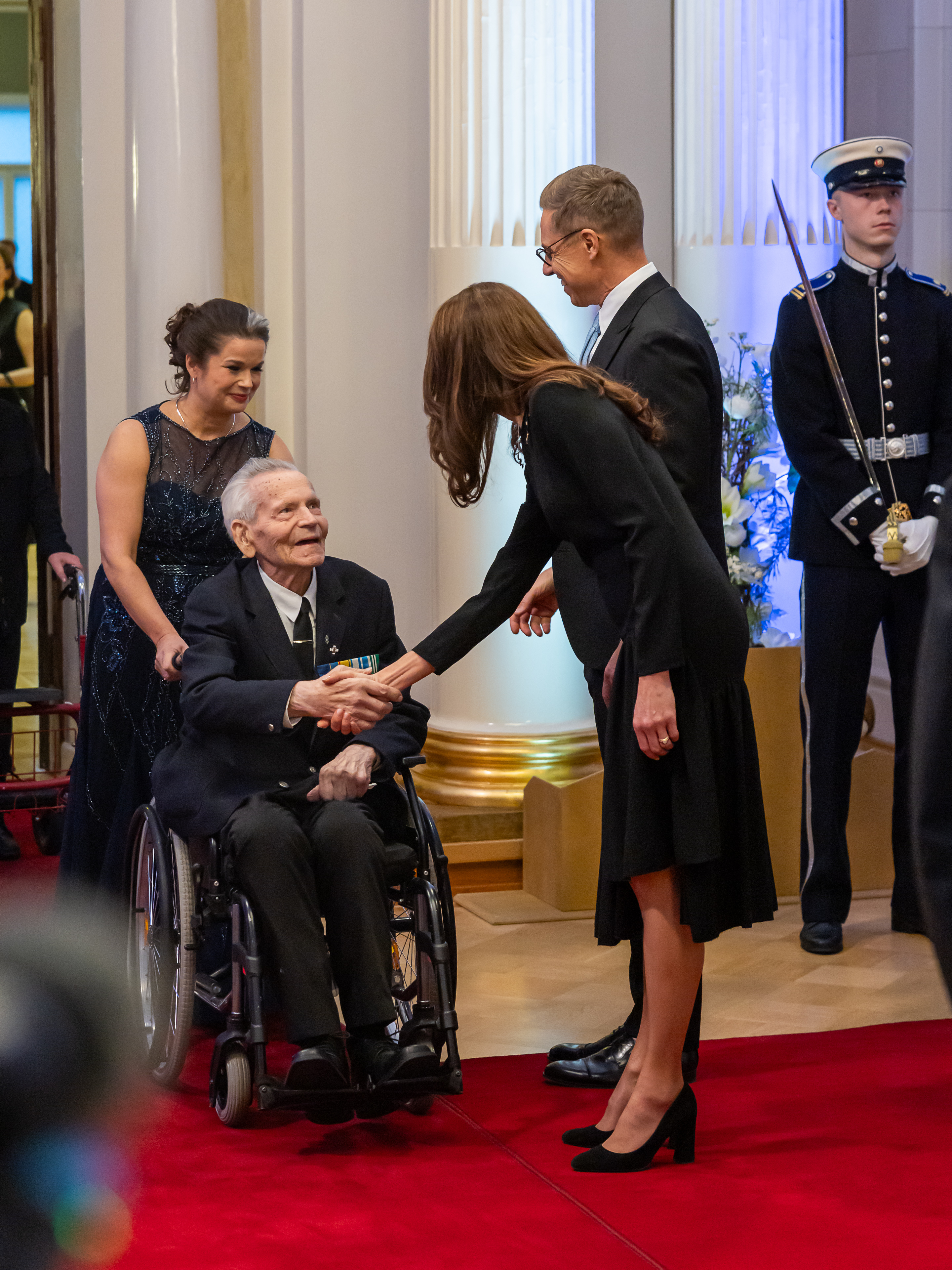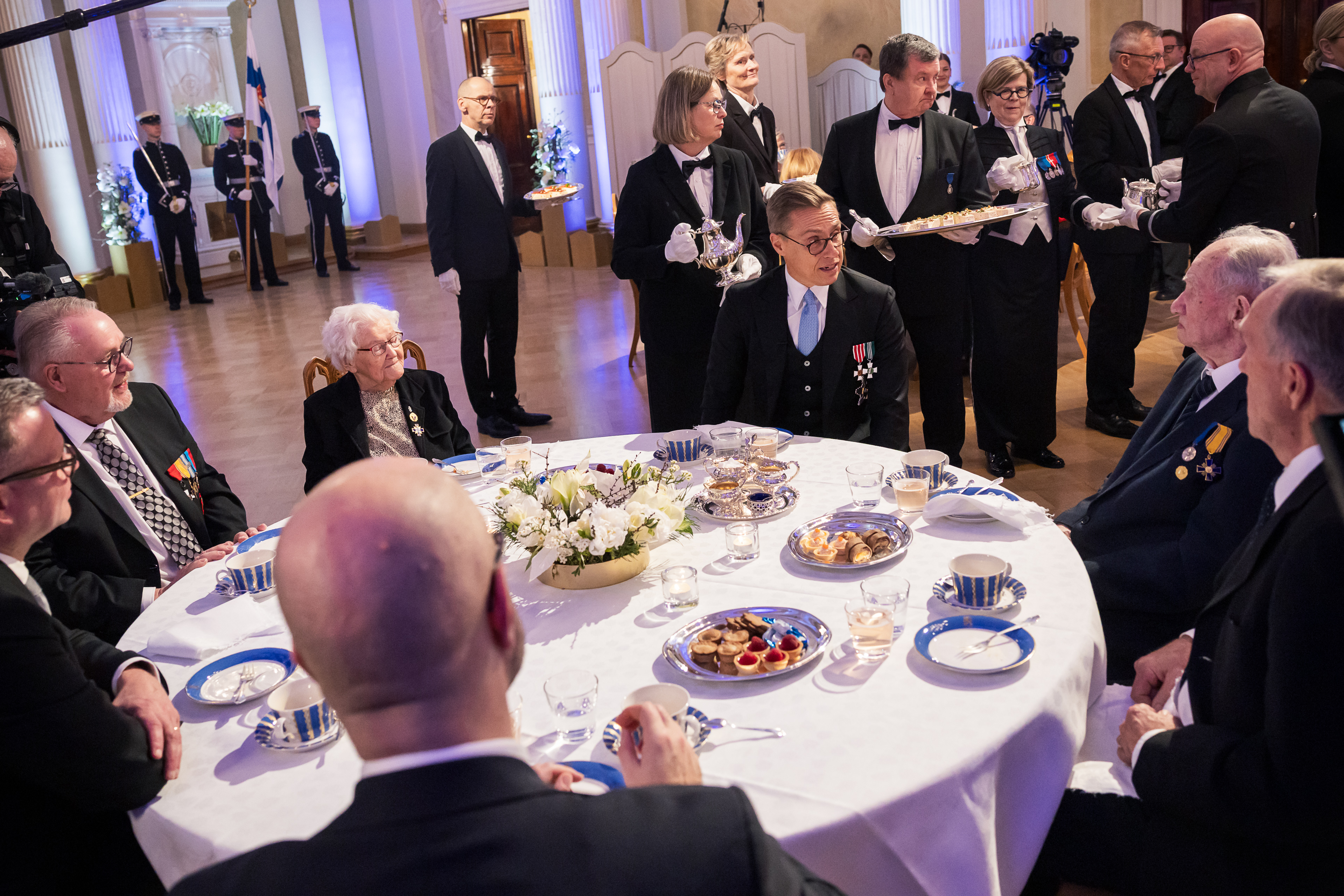 Tasavallan presidentti Alexander Stubb ja hänen puolisonsa Suzanne Innes-Stubb isännöivät veteraanien ja lottien kunniaksi järjestettyä juhlavastaanottoa Presidentinlinnassa tiistaina 2. joulukuuta 2025.