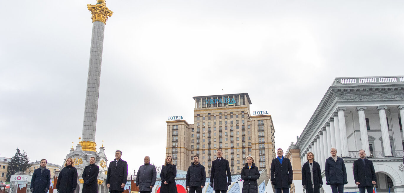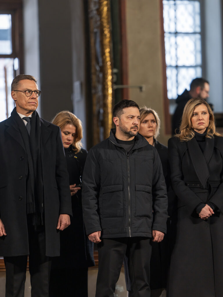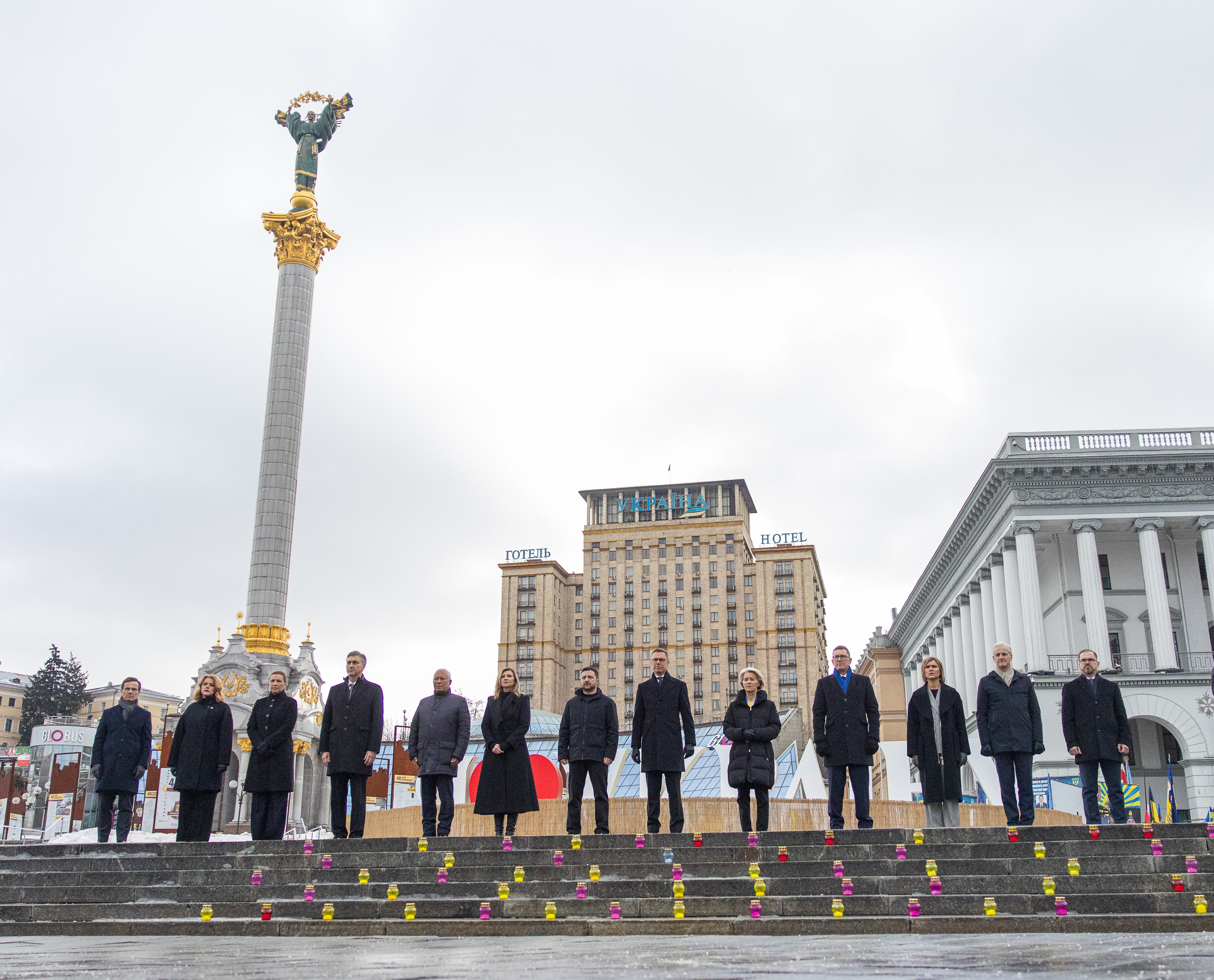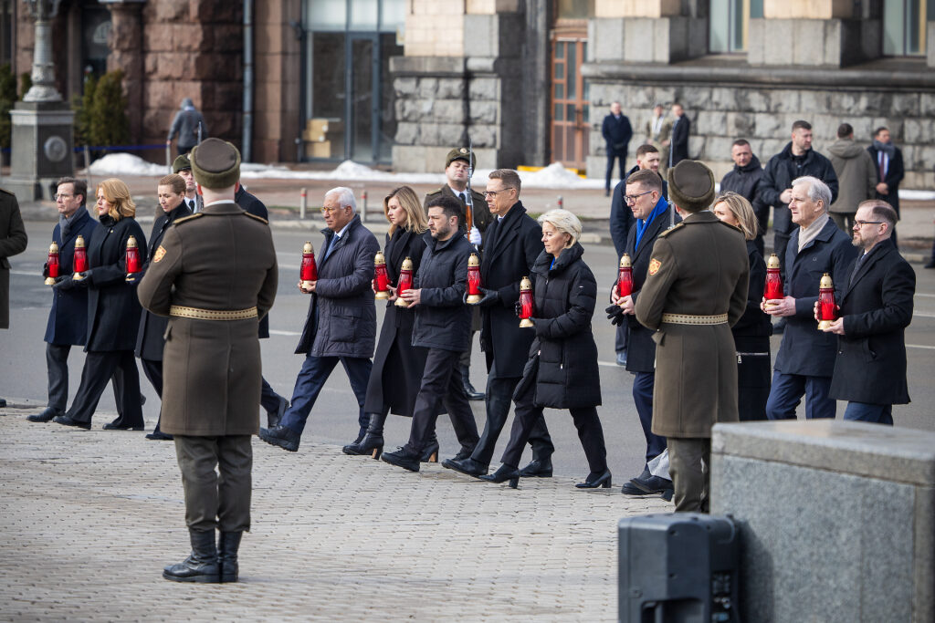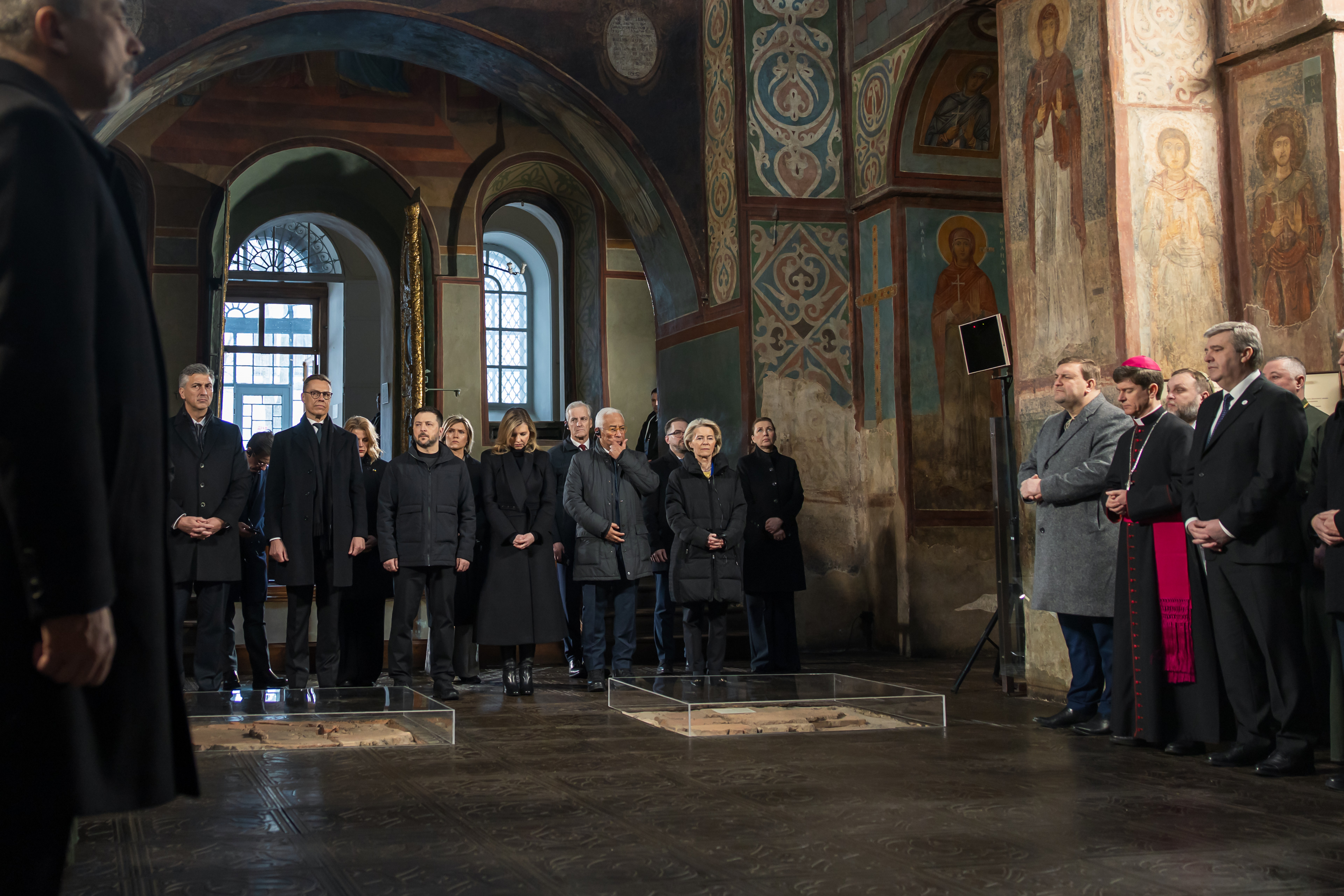 Aamupäivällä vieraat osallistuivat Pyhän Sofian katedraalissa rukoushetkeen yhdessä Ukrainan presidentti Volodymyr Zelenskyin kanssa, ja laskivat Maidanilla kynttilät sodassa kaatuneiden ukrainalaisten sotilaiden muistolle.