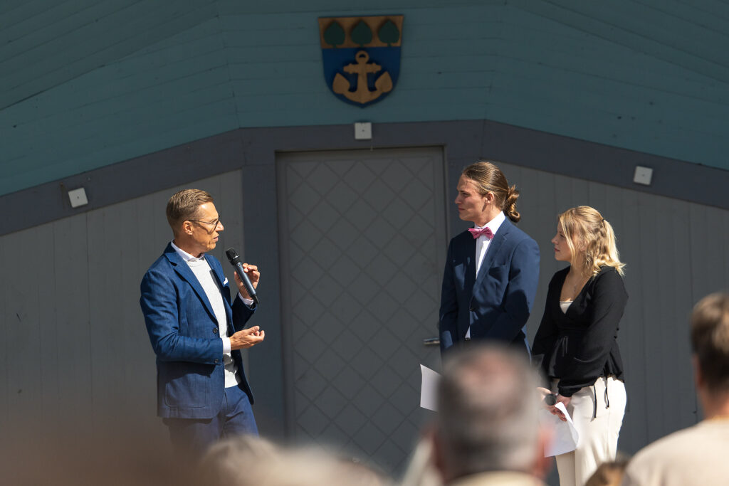 Vierailu päättyi yleisötilaisuuteen Maarianhaminan torille. Presidenttiä haastattelivat nuoret Maximilian Dreyer, 18, ja Nellie Manngård, 18.