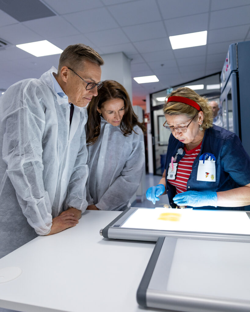 Suomen Punaisen Ristin Veripalvelun päätoimipisteessä presidenttipari tutustui veren matkaan tuotannossa ja testauksessa.