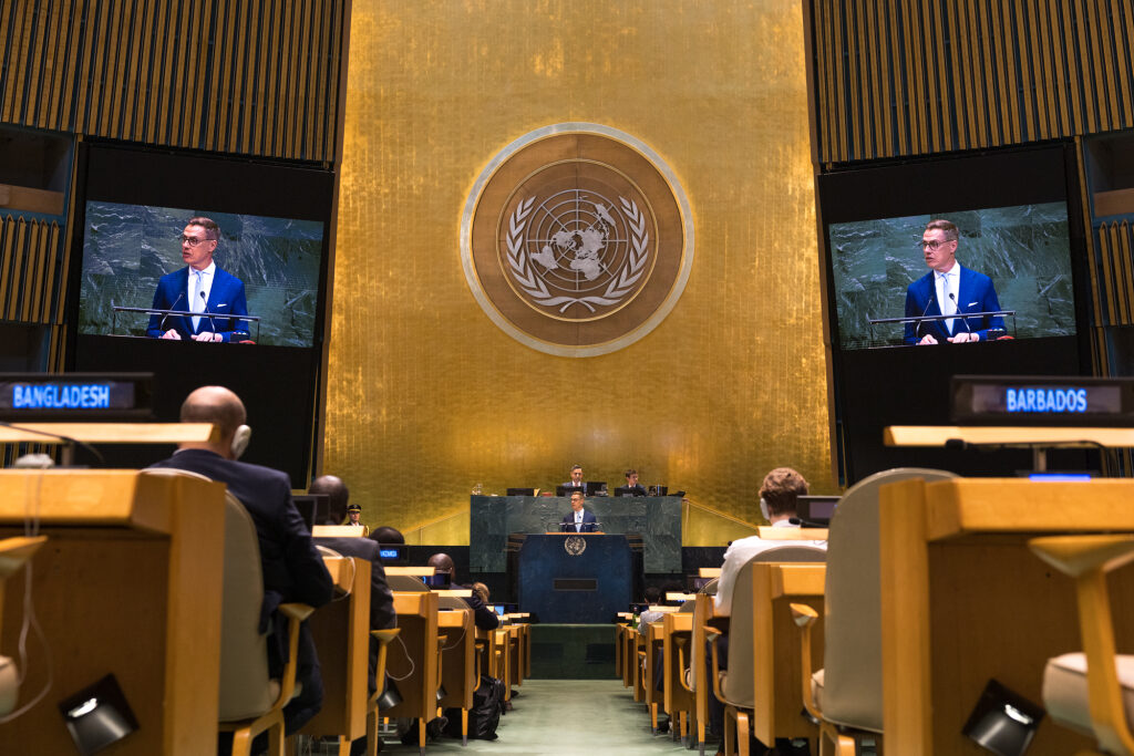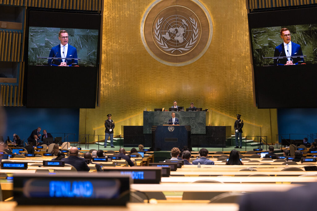 ”FN som organisation är i en situation där det måste reformeras för att kunna fortsätta fungera. Det internationella samfundet klarar för närvarande inte av att lösa konflikter. FN ses inte längre som den främsta garanten för fred och stabilitet”, sade president Stubb.